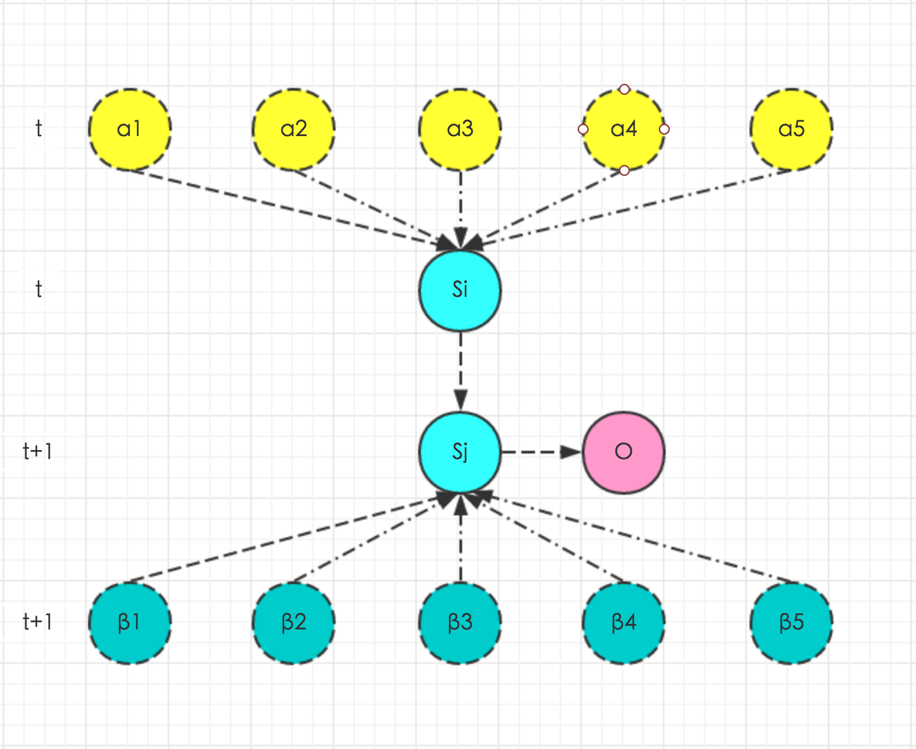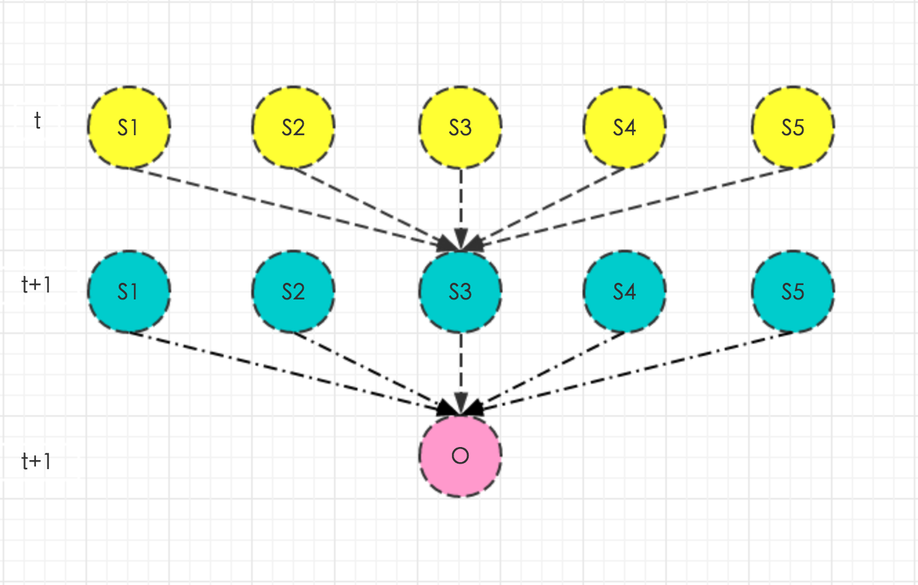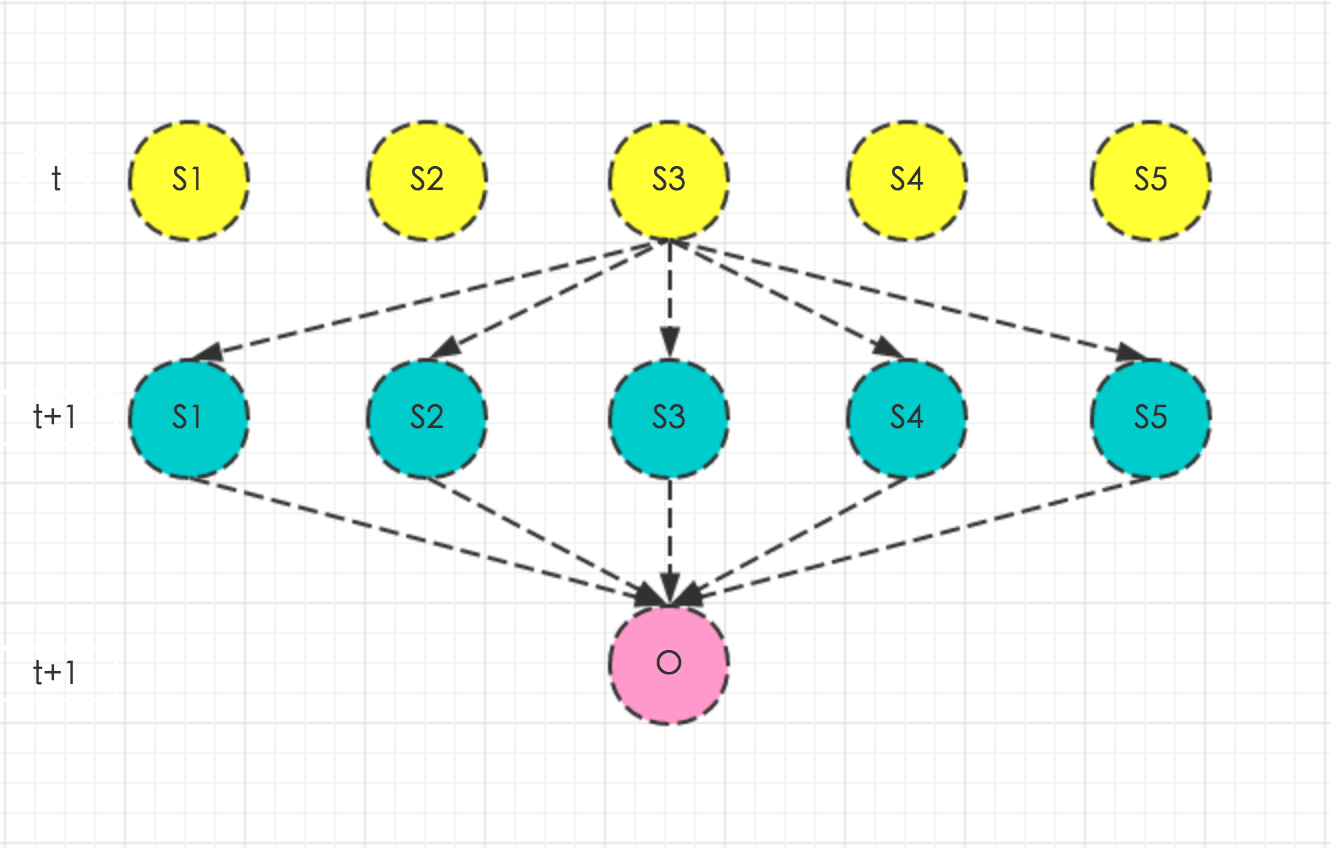 结合上图,很容易看出\(α_t(j)\)和\(α_{t+1}(i)\)之间的关系,即黄圈圈转移到绿圈圈并产生红圈圈的概率乘积和,黄圈圈代表前一时刻\(α_t(j)\)。