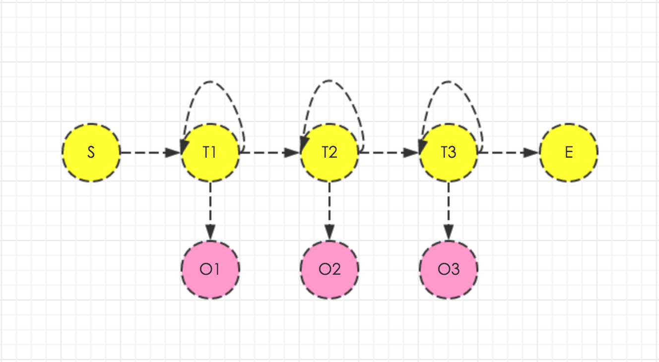 对于给定triphone对应的隐马模型\(λ=(A,B,π)\)以及帧序列为\(O=(o_1,o_2,o_3,…,o_T)\),要推算最有可能的内部状态序列帧序列\(S=(s_1,s_2,s_3,…,s_T)\)。