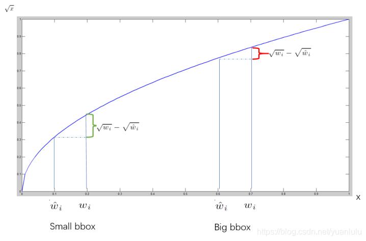 - 对不同大小的bbox预测中,相比于大bbox预测偏一点,小box预测偏一点更不能忍受。而sum-square error loss中对同样的偏移loss是一样。 为了缓和这个问题,作者用了一个比较取巧的办法,就是将box的width和height取平方根代替原本的height和width。 如下图:small bbox的横轴值较小,发生偏移时,反应到y轴上的loss(下图绿色)比big box(下图红色)要大。