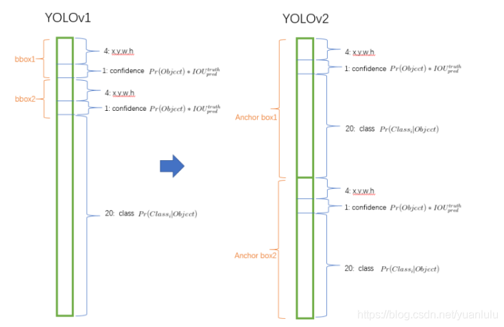 这个图反应了YOLOv2相对于v1的改动。但是注意YOLOv2并不是每个位置预测两个锚框,下面会讲原因。(剧透:其实是5个锚框啦)