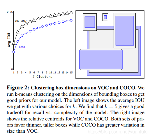 下图是在coco和voc上聚类得到的5个anchor框: