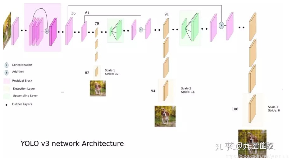 此外,作者还借鉴DSSD的做法,加入了跳跃连接和上采样,实现了高层特征和底层特征的融合。和DSSD一样,使用多尺度的特征图来预测结果。这带来两个结果:1.新的网络结构预测更多的anchor框;2.由于使用了更底层的特征,YOLOv3对小物体的效果更好。(这里借用知乎上的一张图)