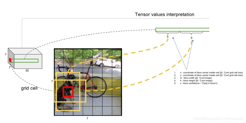7x7x30大小的特征图把图片分成7x7个格子,每个1x1x30负责预测两个box和这个格子对应的20个分类。每个box包含5个值:\(x_{center}, y_{center}, w, h, confiddence \)。前两个值表示anchor中心相对于本格子左上角的偏移值(用格子大小归一化),范围在0到1之间。中间两个值表示预测的box的宽高,用图片大小归一化,范围也是0到1。最后一个值是对于这个box包含目标的信心。