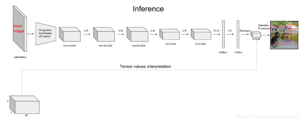 由于yolo属于one_stage的目标检测算法,所以网络结构比较简单。固定输入448x448大小的图片,最后输出7x7x30大小的特征图。